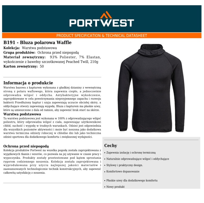 Bluza B191 Waffle to funkcjonalna warstwa bazowa z kapturem, zaprojektowana z myślą o komforcie w chłodniejszych warunkach. Wykonana z gładkiej dzianiny z wewnętrzną stroną w strukturze polaru waflowego, zapewnia doskonałą izolację cieplną, a jednocześnie efektywnie odprowadza wilgoć i oddycha. Dzięki antybakteryjnemu wykończeniu zapobiega powstawaniu nieprzyjemnych zapachów, co czyni ją idealnym wyborem do intensywnego użytkowania.