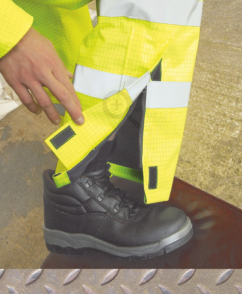 Oddychające spodnie w wykonaniu ostrzegawczym, trudnopalnym i antyelektrostatycznym. Bardzo komfortowe w użytkowaniu dzięki elastycznemu wykończeniu pasa oraz szelkom z szybko wypinającymi się klamrami.